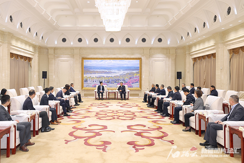 4月28日,自治区党委书记马兴瑞、自治区主席艾尔肯·吐尼亚孜在乌鲁木齐会见国泰集团行政总裁林绍波一行。石榴云/新疆日报记者 崔志坚 摄