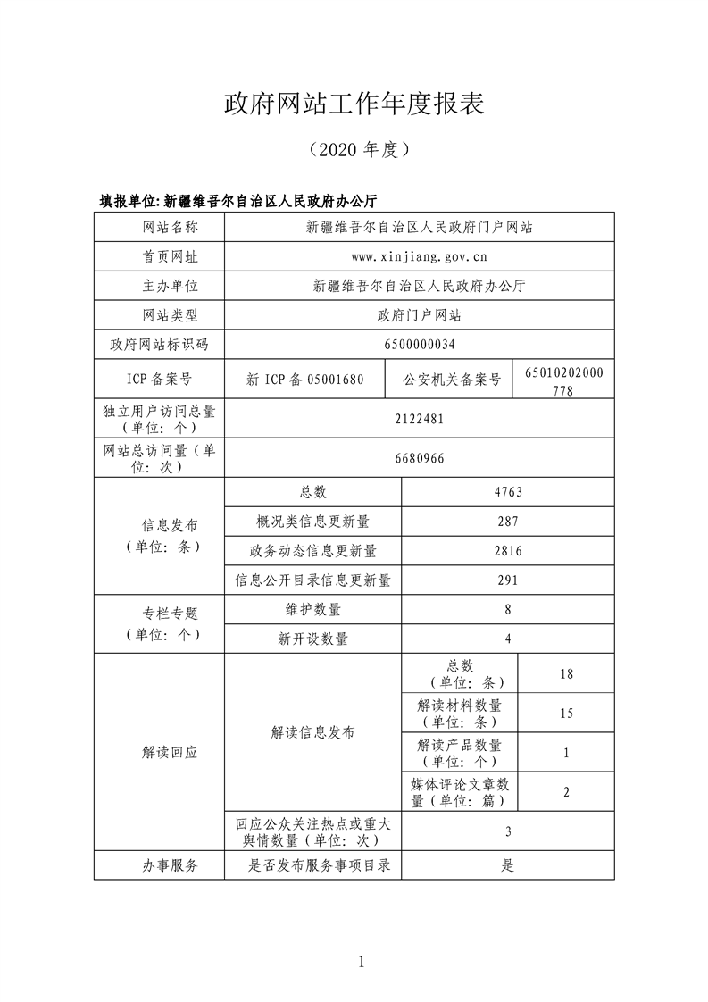 新疆维吾尔自治区政府网站年度报表(2020年)